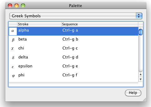 - As of v1.3.5 a palette with almost all available symbols and parts can be raised with Command-Shift-P. A part or symbol can be inserted into an equation by double-clicking on an entry of the palette or by invoking the key sequence shown in the second column. To get a greek letter (when in equation mode) you would have to press Ctrl-g, release all keys and then press a (for alpha), b (for beta),...